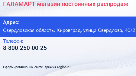 ГАЛАМАРТ, магазин постоянных распродаж по адресу Свердловская область, Кировград, улица Свердлова, 40/2 в дальнейшем Организация, размещена в следующих категориях: