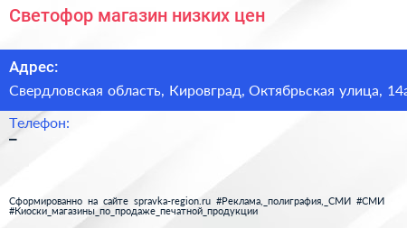 Светофор, магазин низких цен по адресу Свердловская область, Кировград, Октябрьская улица, 14а в дальнейшем Организация, размещена в следующих категориях:
