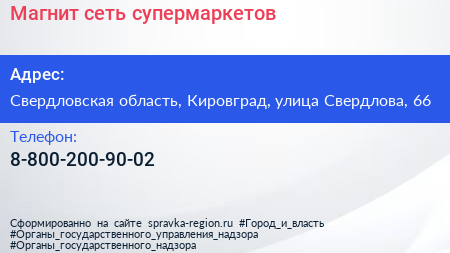 Магнит, сеть супермаркетов по адресу Свердловская область, Кировград, улица Свердлова, 66 в дальнейшем Организация, размещена в следующих категориях: