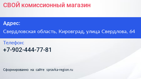 СВОЙ, комиссионный магазин по адресу Свердловская область, Кировград, улица Свердлова, 64 в дальнейшем Организация, размещена в следующих категориях:
