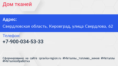 Дом тканей по адресу Свердловская область, Кировград, улица Свердлова, 62 в дальнейшем Организация, размещена в следующих категориях: