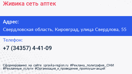 Живика, сеть аптек по адресу Свердловская область, Кировград, улица Свердлова, 55 в дальнейшем Организация, размещена в следующих категориях: