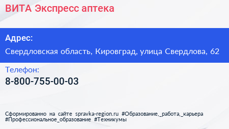 ВИТА Экспресс, аптека по адресу Свердловская область, Кировград, улица Свердлова, 62 в дальнейшем Организация, размещена в следующих категориях: