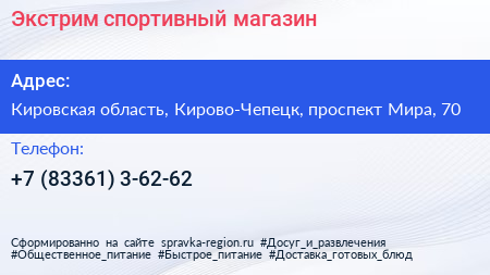 Экстрим, спортивный магазин по адресу Кировская область, Кирово-Чепецк, проспект Мира, 70 в дальнейшем Организация, размещена в следующих категориях: