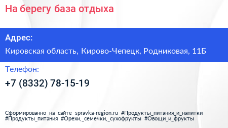 На берегу, база отдыха по адресу Кировская область, Кирово-Чепецк, Родниковая, 11Б в дальнейшем Организация, размещена в следующих категориях: