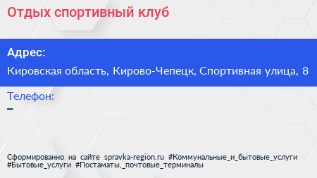 Отдых, спортивный клуб по адресу Кировская область, Кирово-Чепецк, Спортивная улица, 8 в дальнейшем Организация, размещена в следующих категориях: