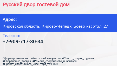 Русский двор, гостевой дом по адресу Кировская область, Кирово-Чепецк, Боёво квартал, 27 в дальнейшем Организация, размещена в следующих категориях: