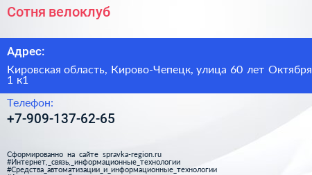Сотня, велоклуб по адресу Кировская область, Кирово-Чепецк, улица 60 лет Октября, 1 к1 в дальнейшем Организация, размещена в следующих категориях: