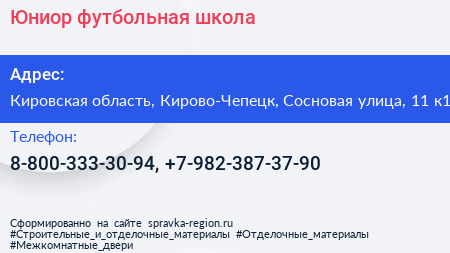 Юниор, футбольная школа по адресу Кировская область, Кирово-Чепецк, Сосновая улица, 11 к1 в дальнейшем Организация, размещена в следующих категориях: