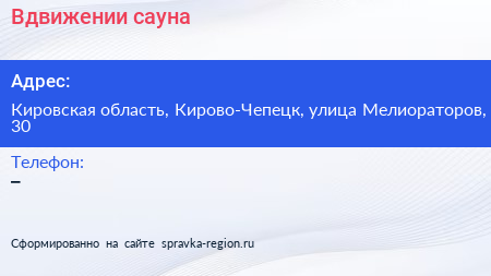 Вдвижении, сауна по адресу Кировская область, Кирово-Чепецк, улица Мелиораторов, 30 в дальнейшем Организация, размещена в следующих категориях:
