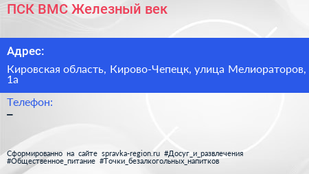 ПСК ВМС Железный век по адресу Кировская область, Кирово-Чепецк, улица Мелиораторов, 1а в дальнейшем Организация, размещена в следующих категориях: