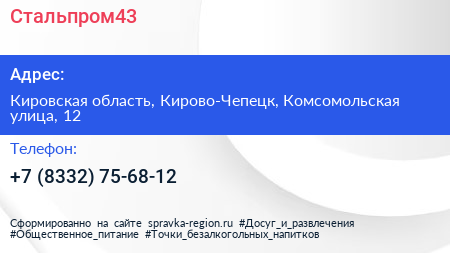 Стальпром43 по адресу Кировская область, Кирово-Чепецк, Комсомольская улица, 12 в дальнейшем Организация, размещена в следующих категориях: