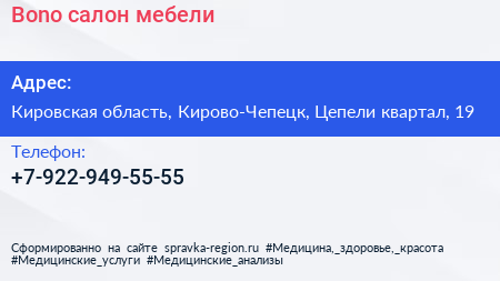 Bono, салон мебели по адресу Кировская область, Кирово-Чепецк, Цепели квартал, 19 в дальнейшем Организация, размещена в следующих категориях: