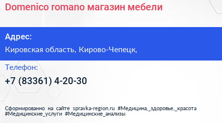 Domenico-romano, магазин мебели по адресу Кировская область, Кирово-Чепецк, в дальнейшем Организация, размещена в следующих категориях: