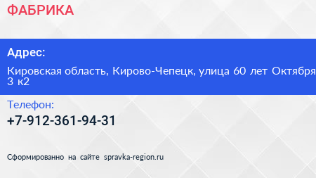 ФАБРИКА по адресу Кировская область, Кирово-Чепецк, улица 60 лет Октября, 3 к2 в дальнейшем Организация, размещена в следующих категориях: