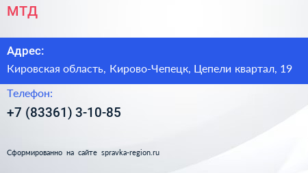 МТД по адресу Кировская область, Кирово-Чепецк, Цепели квартал, 19 в дальнейшем Организация, размещена в следующих категориях: