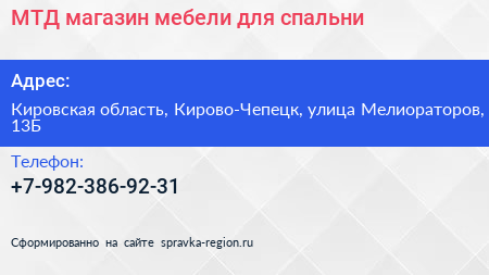 МТД, магазин мебели для спальни по адресу Кировская область, Кирово-Чепецк, улица Мелиораторов, 13Б в дальнейшем Организация, размещена в следующих категориях: