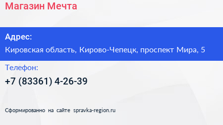 Магазин Мечта по адресу Кировская область, Кирово-Чепецк, проспект Мира, 5 в дальнейшем Организация, размещена в следующих категориях: