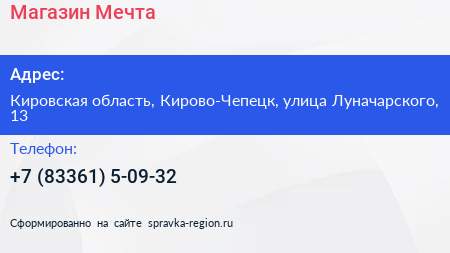 Магазин Мечта по адресу Кировская область, Кирово-Чепецк, улица Луначарского, 13 в дальнейшем Организация, размещена в следующих категориях: