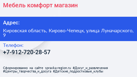 Мебель-комфорт, магазин по адресу Кировская область, Кирово-Чепецк, улица Луначарского, 9 в дальнейшем Организация, размещена в следующих категориях: