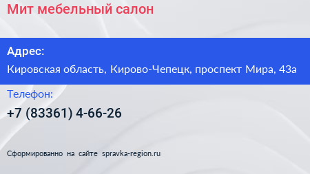 Мит, мебельный салон по адресу Кировская область, Кирово-Чепецк, проспект Мира, 43а в дальнейшем Организация, размещена в следующих категориях: