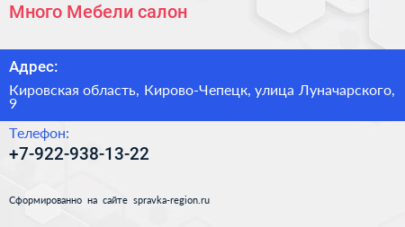 Много Мебели, салон по адресу Кировская область, Кирово-Чепецк, улица Луначарского, 9 в дальнейшем Организация, размещена в следующих категориях: