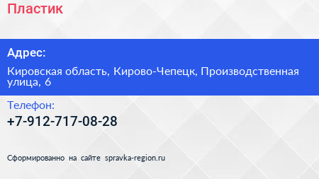 Пластик по адресу Кировская область, Кирово-Чепецк, Производственная улица, 6 в дальнейшем Организация, размещена в следующих категориях: