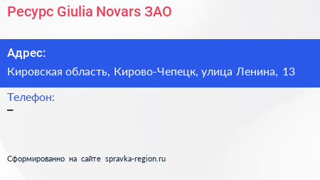 Ресурс Giulia Novars, ЗАО по адресу Кировская область, Кирово-Чепецк, улица Ленина, 13 в дальнейшем Организация, размещена в следующих категориях: