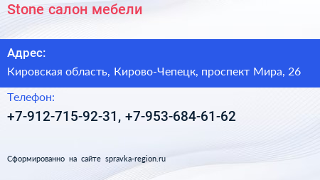 Stone, салон мебели по адресу Кировская область, Кирово-Чепецк, проспект Мира, 26 в дальнейшем Организация, размещена в следующих категориях: