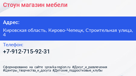 Стоун, магазин мебели по адресу Кировская область, Кирово-Чепецк, Строительная улица, 4 в дальнейшем Организация, размещена в следующих категориях: