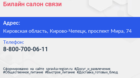 Билайн, салон связи по адресу Кировская область, Кирово-Чепецк, проспект Мира, 74 в дальнейшем Организация, размещена в следующих категориях: