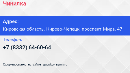 Чинилка по адресу Кировская область, Кирово-Чепецк, проспект Мира, 47 в дальнейшем Организация, размещена в следующих категориях: