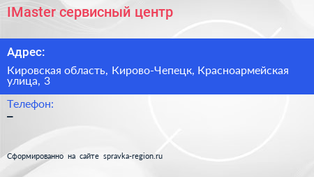 IMaster, сервисный центр по адресу Кировская область, Кирово-Чепецк, Красноармейская улица, 3 в дальнейшем Организация, размещена в следующих категориях:
