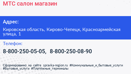 МТС, салон-магазин по адресу Кировская область, Кирово-Чепецк, Красноармейская улица, 1 в дальнейшем Организация, размещена в следующих категориях: