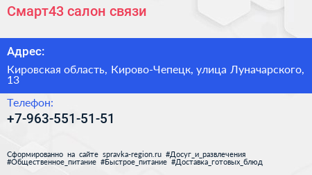 Смарт43, салон связи по адресу Кировская область, Кирово-Чепецк, улица Луначарского, 13 в дальнейшем Организация, размещена в следующих категориях: