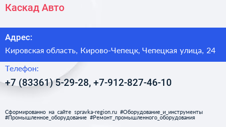 Каскад-Авто по адресу Кировская область, Кирово-Чепецк, Чепецкая улица, 24 в дальнейшем Организация, размещена в следующих категориях: