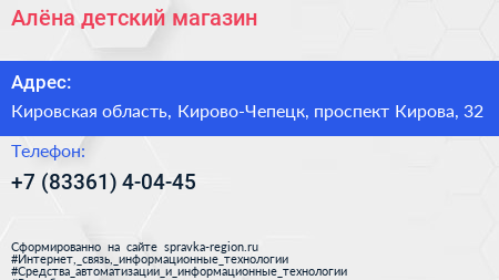 Алёна, детский магазин по адресу Кировская область, Кирово-Чепецк, проспект Кирова, 32 в дальнейшем Организация, размещена в следующих категориях: