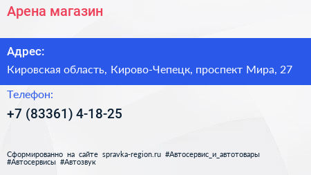 Арена, магазин по адресу Кировская область, Кирово-Чепецк, проспект Мира, 27 в дальнейшем Организация, размещена в следующих категориях: