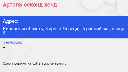 Артэль, секонд-хенд по адресу Кировская область, Кирово-Чепецк, Первомайская улица, 9 в дальнейшем Организация, размещена в следующих категориях: