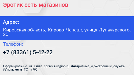 Эротик, сеть магазинов по адресу Кировская область, Кирово-Чепецк, улица Луначарского, 20 в дальнейшем Организация, размещена в следующих категориях: