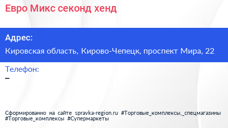Евро-Микс, секонд-хенд по адресу Кировская область, Кирово-Чепецк, проспект Мира, 22 в дальнейшем Организация, размещена в следующих категориях: