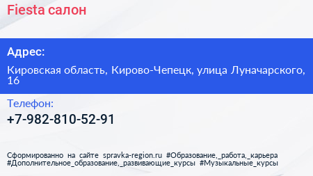 Fiesta, салон по адресу Кировская область, Кирово-Чепецк, улица Луначарского, 16 в дальнейшем Организация, размещена в следующих категориях: