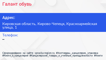 Галант обувь по адресу Кировская область, Кирово-Чепецк, Красноармейская улица, 1 в дальнейшем Организация, размещена в следующих категориях: