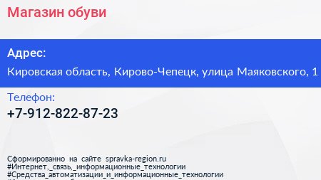 Магазин обуви по адресу Кировская область, Кирово-Чепецк, улица Маяковского, 1 в дальнейшем Организация, размещена в следующих категориях: