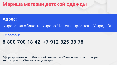 Мариша, магазин детской одежды по адресу Кировская область, Кирово-Чепецк, проспект Мира, 43г в дальнейшем Организация, размещена в следующих категориях: