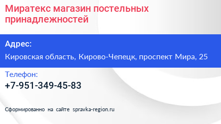Миратекс, магазин постельных принадлежностей по адресу Кировская область, Кирово-Чепецк, проспект Мира, 25 в дальнейшем Организация, размещена в следующих категориях: