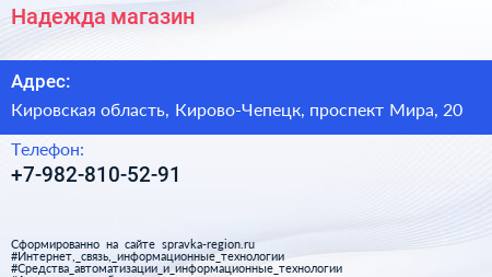 Надежда, магазин по адресу Кировская область, Кирово-Чепецк, проспект Мира, 20 в дальнейшем Организация, размещена в следующих категориях: