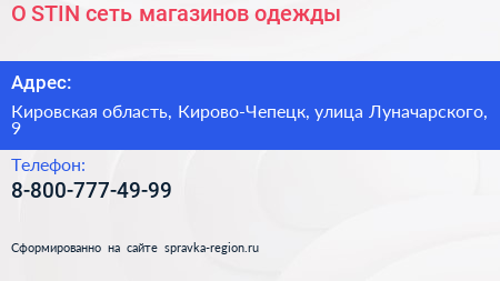 O`STIN, сеть магазинов одежды по адресу Кировская область, Кирово-Чепецк, улица Луначарского, 9 в дальнейшем Организация, размещена в следующих категориях: