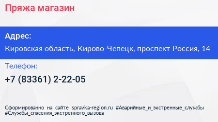 Пряжа, магазин по адресу Кировская область, Кирово-Чепецк, проспект Россия, 14 в дальнейшем Организация, размещена в следующих категориях: