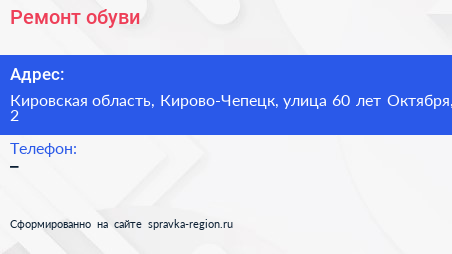 Ремонт обуви по адресу Кировская область, Кирово-Чепецк, улица 60 лет Октября, 2 в дальнейшем Организация, размещена в следующих категориях:
